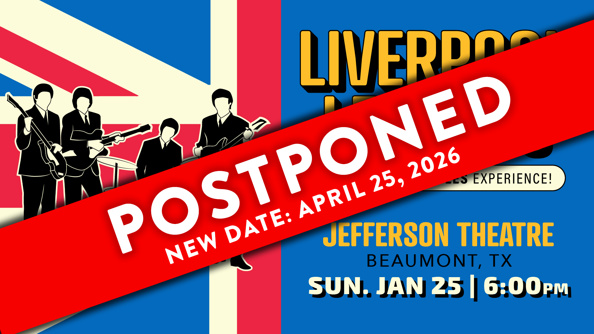 Jefferson Theatre 345 Fannin, Beaumont, TXUPDATE Due to the weather forecast for Sunday and with guest travel safety our top priority, the Liverpool Legends concert is being postponed to Saturday, April 25, 2026. Tickets for the original date will be honored! For additional information please contact your point of purchase. Stay safe and warm! ________________________________________________________________________________________________________________ About the group: Liverpool Legends are [...]